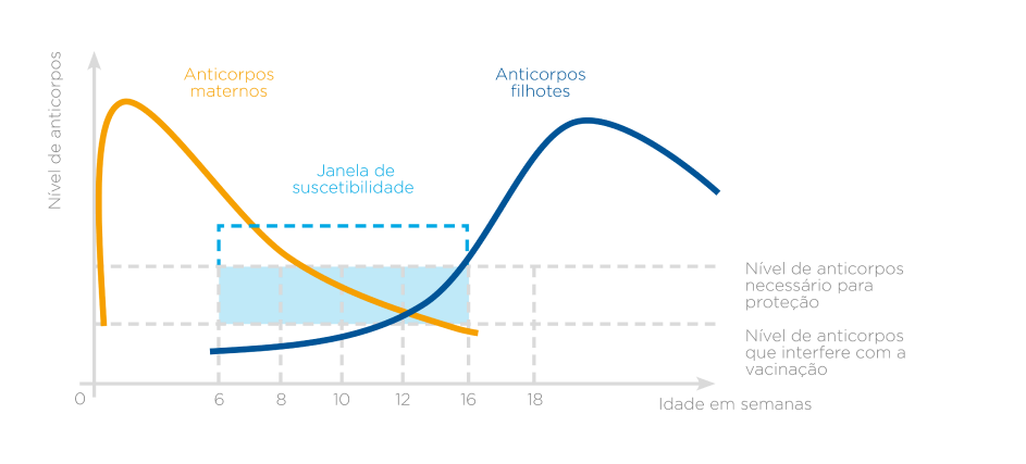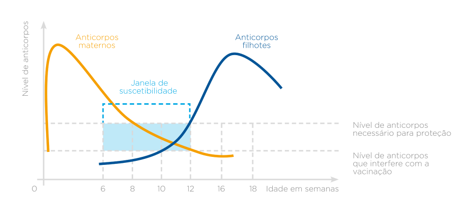 O período que compreende a transição entre a queda dos AM e a elevação dos anticorpos produzidos pelo filhotes em resposta à vacinação, apesar de nenhum dos 2 níveis estarem adequados para garantir a proteção, é chamado de JANELA DE SUSCETIBILIDADE1 (Figuras 1 e 2).
