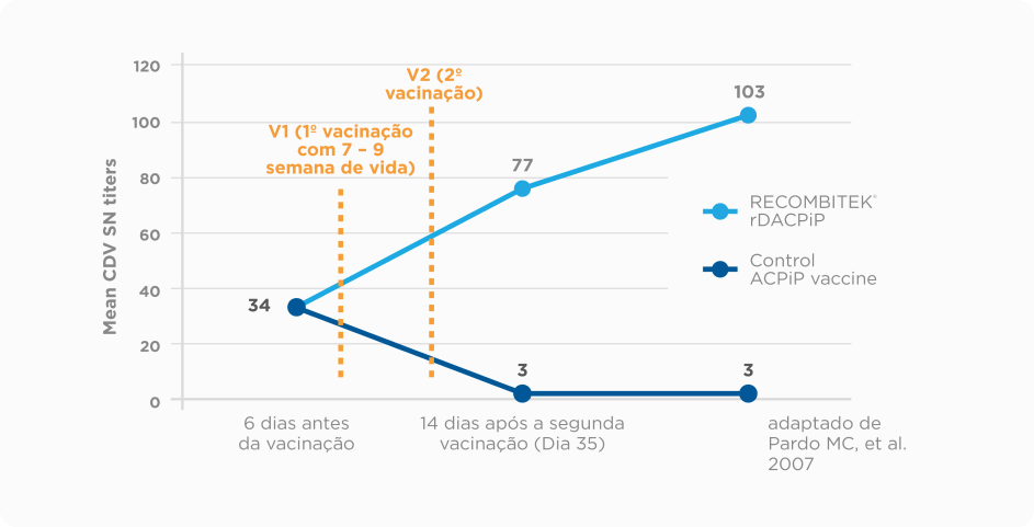 Recombitek® promove uma proteção rápida e constante contra cinomose mesmo na presença dos anticorpos maternos6
