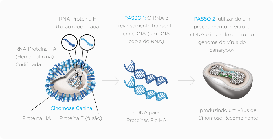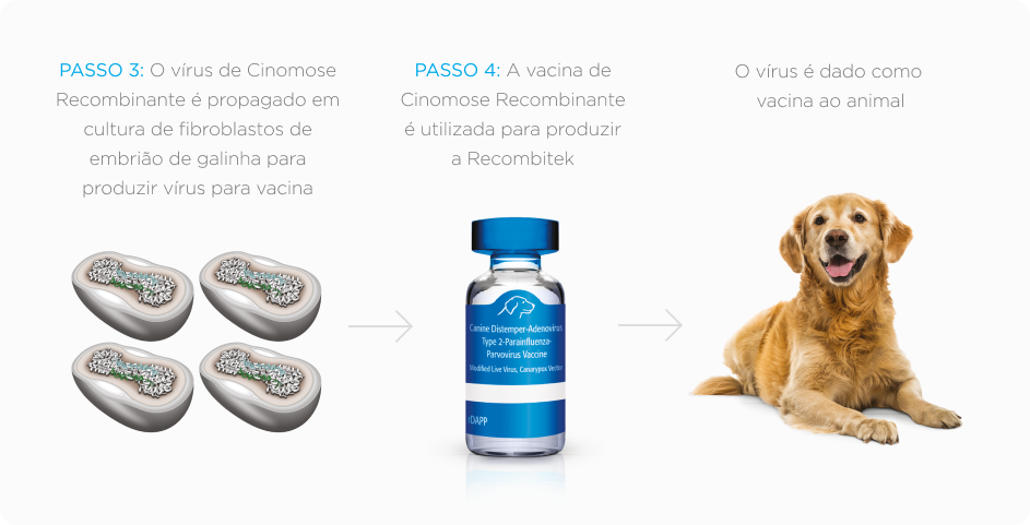 A vacina recombinante, como as Recombitek® C6/cv e C4/cv, consiste em um portador ou vetor que transporta uma pequena porção do material genético do vírus causador da doença. Quando introduzidas (e expressas) no corpo do animal, as vacinas recombinantes podem desencadear uma imunidade protetora e robusta contra o organismo patogênico. Como apenas fragmentos genéticos e não o organismo patogênico completo são incorporados ao vetor, não é possível que a vacina recombinante produza doença ativa no animal vacinado.